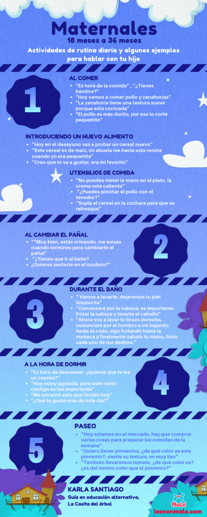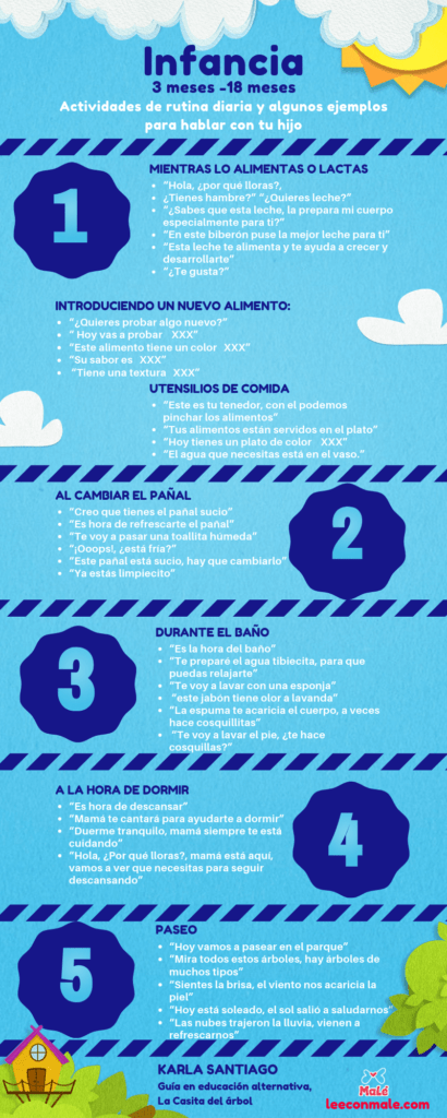 Habla con tu chico desde que es un bebé, habla sobre lo que estás haciendo mientras cocinas y él te mira. Habla sobre lo que ves a tu alrededor mientras están en la playa. Háblale, sobre el juguete que tiene a mano, describe su color, forma y textura. Te invito a mirar mi artículo anterior “Amor, cantar y Leer” donde explico otras actividades que pudieras realizar con tus chicos.